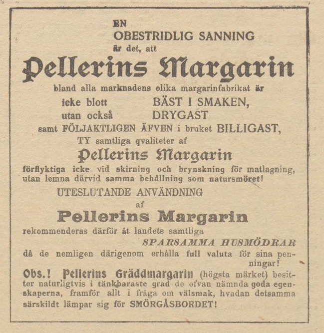 Idag finna allehanda begränsningar kring vad som får sägas i reklamen. År 1901 var företagarna mycket friare att komma med påståenden av olika slag. Reklamen för Pellerins Margarin slog ofta fast ”sanningar” och dagens annons innehåller fler än vad som på länge skådats i tidningarna.