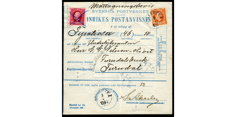 Inrikes postanvisning avsänd från Sollefteå 3 april 1903 till Furudal, Dalarna.