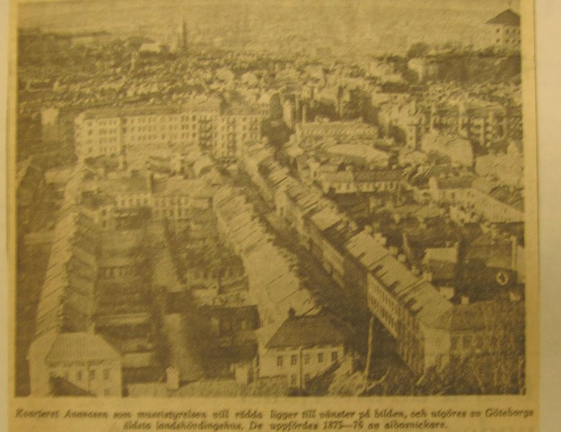 ”På tisdagen föll dödsdomen över stadsdelen Annedals landshövdingehusbebyggelse. Byggnadsnämnden godkände med mindre, tekniska ändringar slutgiltigt det tidigare utställda stadsplaneförslaget, som innebär totalsanering av stadsdelen. Det innebär inte bara att de doktorerande Chalmersarkitekternas förslag till bevarande och upprustning av de gamla husen förkastas. Beslutet innebär också att nämnden ånyo avvisade det förslag om bevarande av kv Ananasen och halva Citronen med den mellanliggande Albogatan som har stadens äldsta landshövdingehus, som förkastades 1969 och som nu efter ekonomisk utredning upptagits till ny prövning.
