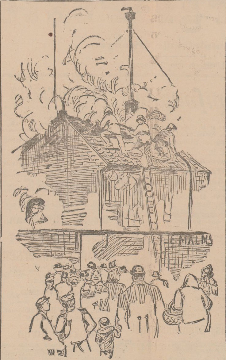 Brandmanskapet hade en svår dag i går. Af det strömmande vattnet genomdränktes såväl oljerockar som underkläder och vattnet formligen flöt af en del af dem. Man kan tänka sig hur det skall kännas att stå och hålla våta slangar i en isande sydostvind, under det röken slår en i ögonen så att den nästan förtar en andedräkten! En brandkarl svimmade ock af röken och måste föras bort, men kryade till sig efter en stund; en annan hade genomvåt och stelfrusen tagit sin tillflykt till maskinrummet för att där söka värma sig en smula. Några välvilliga personer anträffade honom där, likblek och nästan förlamad, och skaffade honom något varmt att dricka, hvarpå lifsandarne snart återuppväcktes hos honom och han blef lika hurtig som någonsin förut. Och hurtiga voro ”alle man” och arbetade oförtrutet med släckningsarbetet långt in på kvällen, då elden alltmer fick ge tappt och blott hvitgula ångor påminde om eldsvådan. Eftersläckningen pågick till inemot midnatt