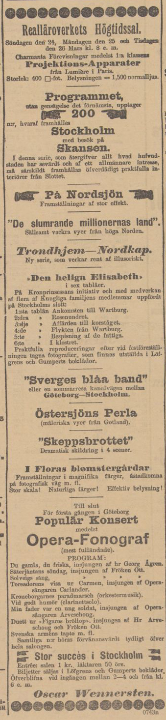 ”Förevisningar medels projektionsapparater gifver hr Oscar Wennersten å Reallärovärkets högtidssal på söndag och de två följande dagarna.