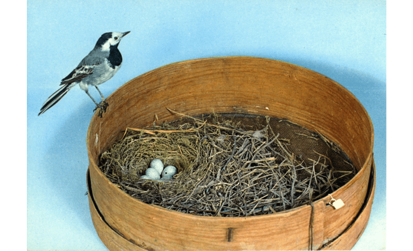 Bilden i sidhuvudet är hämtad från Digitalt museum: ‘Ingår i en serie med Fotonr. 5419 med Göteborgs Naturhistoriska museums olika vykort genom åren. :: :: Monterad Sädesärla med bo. ”White Wagtail with nest”’