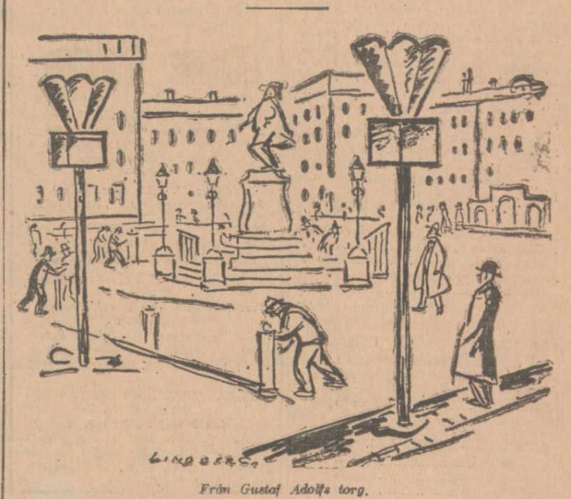 Gustaf Adolfs torg spelar emellertid huvudrollen. Det har under de långa, ljusa aftnarna varit en livligt gouterad plats för promenaderna. Och ända in på de sista kvällstimmarna har allmänheten kunnat följa arbetet. De blåblusade karlar, som byggt in musikestraden till Rådhustrappan, ha inte givit sig någon ro, fast det lidit till kväll, flaggstängernas utplanterare inte heller. De resliga stängerna för jubileets jättevimplar lågo i går afton i väntan på att resas.