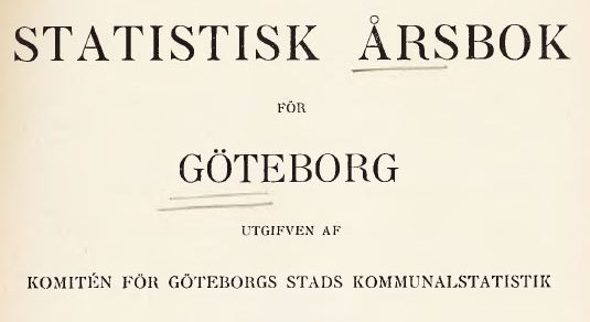 Beredningen hemställer att stadsfullmäktige måtte besluta, att kommunalstatistiska redogörelser för Göteborg skola, årligen, första gången under innevarande år, utarbetas af en särskild komité, benämd ”Komitén för Göteborgs stads kommunalstatistik” och bestående af stadsfullmäktiges ordförande, vice ordförande och sekreterare. Den i år utkommande redogörelsen föreslås skola afse tioårsperioden 1891-1900 samt, där ämnet gör sådant önskvärdt, äfven längre tid tillbaka. Kostanden för den första vidlyftiga årgången beräknas till 5,000 kr. samt för de följande 3,000 kr.” (Ur: Göteborgs-Posten 7 maj 1901)