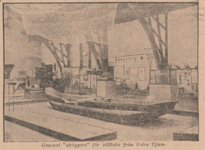 Till höger bl. a. givas avdelningar, belysande båtattiralj (personlig utrustning) och sillfiske, för visso en av utställningens intressanta. Mitt ibland modellutställningarna skjuta upp ett par montrer för Avance och Skandia-motorerna. Och över samlingen draperier av klingande äkta västsvenska fångstredskap. De materialmodeller man återfinner inom avdelningen — Mjärdgården från Tyssön. Katsegården från Hjälmaren. Sjöbodarna från Vänern och krakemodellerna från Näs och Tossö såsom belysande för sötvattensfisket ha förvisso ett synnerligen högt värde.