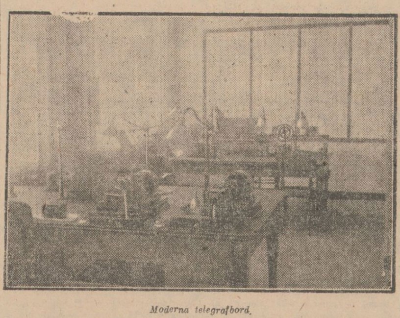 ”Även telegrafen är en institution med gamla anor. Det är något, som man blir lvligt övertygad om, när man gör ett besök på Telegrafverkets historiska utställning i den vita staden. Skulle man döma efter utvecklingen av apparaterna borde den vara minst tusen år gammal; så oerhörd är skillnaden mellan den optiska telegrafen från slutet av sjuttonhundratalet och våra dagars hypermoderna elektriska apparater med deras skrivmaskinsskrift och lätt påklistrade remsor. Däremot gör väl knappast telefonen, vad de yttre förändringarna beträffar, några anspråk på att vara mer än ett decennium gammal: det är underbart, hur det yttre skalet behållit sig oförändrat från Bells första typ till våra egna Betulandapparater där den lilla vackra telefonissan utan vidare blivit struken ur tillvaron och ersatt med en visare och några invecklade mekaniska apparater som blott en telefondirektör begriper sig på. Telegrafverkets utställning ger en utmärkt bild av denna sagolika utveckling, och om den värderade läsaren har lust, skall jag ge honom en liten föreläsning. Demonstrationsmaterialet finnes till påseende på utställningen, ingången från Stora gården mitt emot huvudrestaurantens baldakin. För dess betydelse ansvarar förste kontrollör Risberg och för mina upplysningar dels katalogen, dels en mycket kunnig och saklig telefontjänsteman, som jag i går träffade där uppe, herr Gunnar Eriksson.