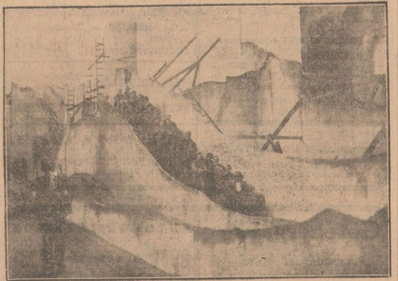 Vår fotograf bad Jenzén att få taga ett foto av berg- och dalbanan i brantaste stupet – alltså däruppifrån, där mannen med den röda flaggan står – var hr Jenzén inte absolut avvisade. Men den, som skall komma ditupp, bör vara där klockan fyra på aftonen och kommer inte därifrån förrän klockan tolv, när den sista vagnen gått. Han kan annars så lätt följa med det rasande tåget ned genom virvlarna.