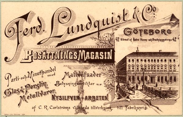 Bilden i sidhuvudet är hämtad från Göteborgs stadsmuseum, Carlotta: Ferd. Lundquist & Co BOSÄTTNINGSMAGASIN Parti- och Minuthandel med Glas & Porslin, Metallvaror, NYSILFVER-ARBETEN Mattväfnader Belysningsartiklar m.m. af C. R. Carlströms välkända tillverkning, till Fabrikspris. GÖTEBORG 42 Hörnet af Östra Hamn- och Drottninggatorna 42 Göteb. Lith. Aktiebol. 208.