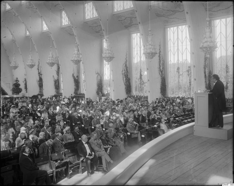 En av sommarens stora händelser, professor Einsteins redogörelse för sin relativitetsteori timade i går middag i utställningens kongresshall, som trots hettan var till stor del fullsatt. Konungen och landshövdingen voro bland åhörarna och förutom naturforskaremötets deltagare hade även allmänheten beviljats tillträde och också begagnat sig därav i rätt stor utsträckning. Professor Einstein är en ypperlig talare, men akustiken svek vid åtskilliga tillfällen under hans föredrag, och ämnet är därtill alltför vidlyftigt för att kunna refereras med några större anspråk på vederhäftighet. Emellertid voro åhörarna synnerligen intresserade och tackade föreläsaren med en ihållande applåd.