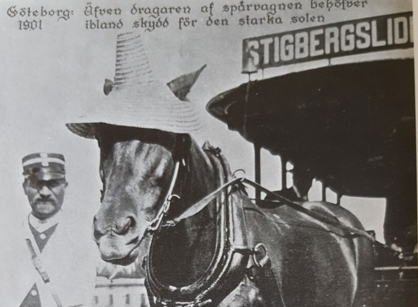 ”Från och med i går middag ståta Göteborgs spårvagnshästar med gula halmhattar, väl ej af senaste parisermode men enigt djurskyddsföreningens modell, med liten sockertoppsformad kulle och så koketta, att hvilken strålande ungmö som hälst skulle vilja tjusa till i en sådan hatt – blott det icke vore hål för öronen att sticka upp igenom.