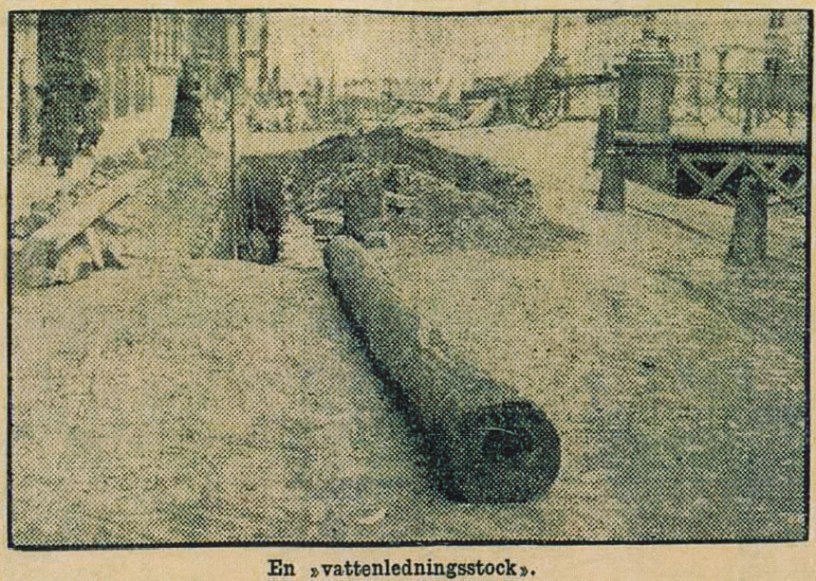 ”Under gräfningar för en kloakledning, hvilka som bekant för närvarande äga rum i Östra Hamnkanalen, har man funnit lämningar efter Göteborgs äldsta vattenledning. Det är en särskild ledning, som gått från den berömda och ännu i dag högt uppskattade Kallebäckskälla ned till Lilla Bommen. Vattnet har ledts genom en ledning hvars rör bestått af trädstockar, som urholkats därigenom att man tagit ur märgen. Bilden visar en dylik »vattenledningsstock» upptagen ur marken under de nuvarande gräfningarna.” (Ur: Göteborgs Aftonblad 21 september 1915)