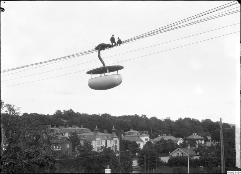 ”Vid tvåtiden i går middag blev det för tredje gången i sommar stopp på utställningens linbana. Man förklarar denna gång missödet med att bromskabeln på den åt Örgrytehållet vettande banan gick sönder. En sträng i kabeln har under den flitiga användningen nötts av och rullade upp sig på känt sätt. Gondolen, vars lina gick sönder, var tom, den andra, som kom från Lisebergshållet, hade flera passagerare. Alla förhöllo sig lugna under färden. Några förpassade sig helt lugnt och stilla ned på marken med tillhjälp av de nu medförda säckarna, de övriga väntade den timma, reparationen tog. Linbanebolagets verkmästare, hr Bernström, klättrade ut på kablarna och återställde det hela. Nya säkra kablar lära ha kommit från England just i går. Det går an att åka igen på linbanan. Det är under inga förhållanden farligt, betonas det, inte ens, när det blir stopp.” (Ur: Göteborgs Aftonblad 17 augusti 1923)