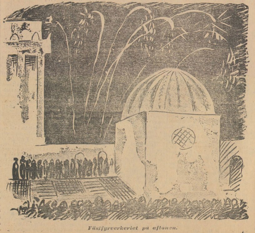Bilden i sidhuvudet är hämtad ur Göteborgs Aftonblad 16 oktober 1923, teckningen visar det avslutande fyrverkeriet.