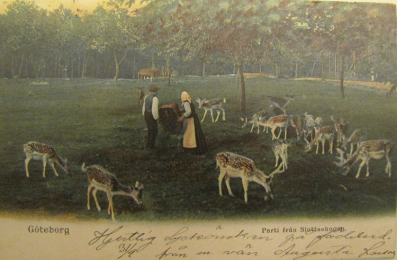Bilden i sidhuvudet visar hjorthägnet i Slottsskogen 1904, vykort ur privat samling.