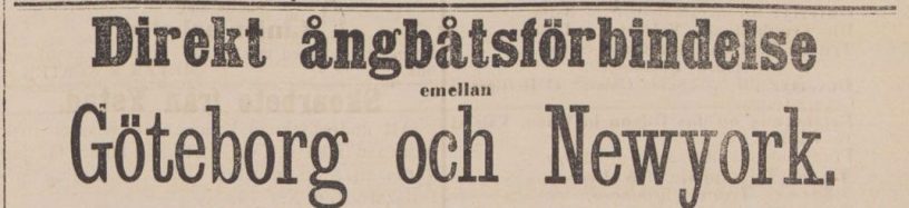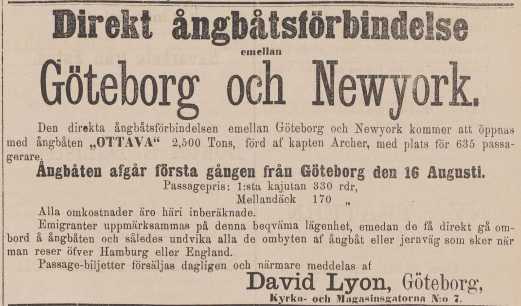 Emigrationen från Sverige hade 1866 ännu inte nått några stora volymer men den var tillräckligt stor för att locka rederier att intressera sig för att hämta emigranter i Göteborg för en direkttransport till New York (Newyork). Biljetter såldes av David Lyon som hade kontoret på Kyrko- och Magasinsgatorna N.o 7. Direkttrafik till Nordamerika brukar annars sägas börja i och med Svenska Amerikalinjen, men det fanns försök långt innan dess.