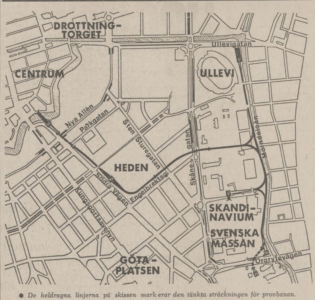 ”En provbana för cabtrack (spårtaxi) planeras för Göteborg. Elbilar som på spår pilar kors och tvärs i centrum i Göteborg låter kanske som science fiction men är en realitet. Provbanan, som är kostnadsberäknad till ca 10 milj kr beräknas vara klar under 1973, samma år som Liseberg firar 50-årsjubileum. Den blir 2.500 m lång, går i markplan, i tunnel och på viadukt. Den får förbindelse med bl a Liseberg, Svenska Mässan, Skandinavium, Ullevi och centrum. Allt styrs med hjälp av data. Varje bil tar fyra passagerare. Elbilarna sköter med hjälp av data inväxlingen till rätt spår. Transporthastigheten beräknas bli ca 60 km/tim. Passageraren sätter sin biljett i en biljettmaskin och därmed har elbilen fått sin upplysning om till vilken station passageraren vill. Därefter åker den ut på en accelerationssträcka, pilar in på rätt plats på huvudbanan och ger sig iväg utan omvägar till den önskade stationen.