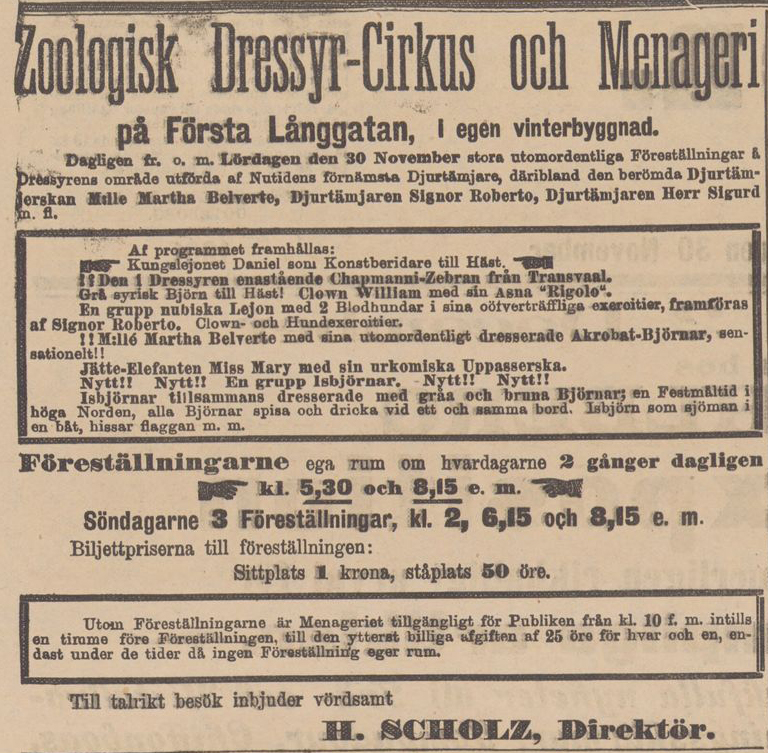 ”Scholz menageri, kändt sedan gammalt af göteborgarne, har nu åter kommit till staden. Men är själfva menageriet en gammal bekantsap så kan man icke säga detsamma om det som visas. Tvärtom bjuder oss menageriets dressyr-cirkus på en hel del nyheter. Bland dessa märkas en dresserad zebra, två ryska björnar framförda af djurtämjerskan m:lle Martha Belvarte, tre isbjörnar samt tre lejon, framförda af djurtämjaren signor Roberto. Föreställningen clou är lejonet Daniel som konstberidare.