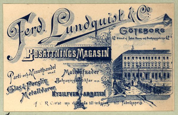 Bilden i sidhuvudet är hämtad från Göteborgs stadsmuseum, Carlotta: Reklam för Ferd. Lundquist & Co.