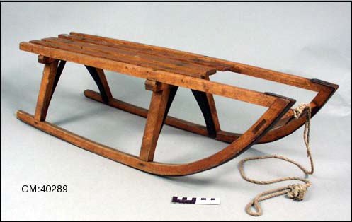 Bilden i sidhuvudet är hämtad från Göteborgs stadsmuseum, Carlotta: Kälke för barn. Underrede av stålskodda medar och två järnförstärkta bockar; sits: två sidolister som framtill förenar sig med de uppböjda medarna och däremellan tre glest placerade bräder fastskruvade vid bockarna. Framslå mellan medarna varvid styrlina av bomullsrep är fäst.