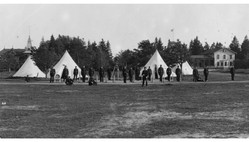 Bilden i sidhuvudet är hämtad från Digitalt museum: Soldater ur Älvsborgs regemente I 15 uppställda utanför tält på Fristad hed.