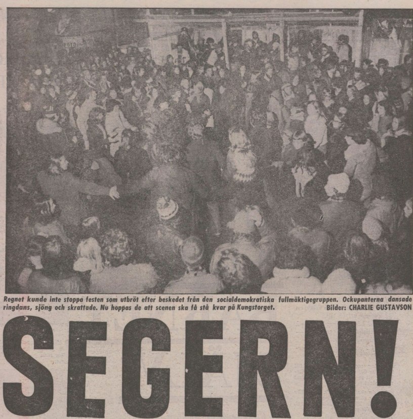 Så ockupanterna fick ensamma fira segern i regnet över Kungstorget. Enhälligt antogs en resolution om att avbryta ockupationen. Men beredskapen finns kvar. I resolutionen sägs det bl a: – Om någon fortfarande tror sig kunna påbörja bygget kommer vi naturligtvis tillbaka, antingen det påbörjas av borgarna eller socialdemokraterna, före eller efter nyår.