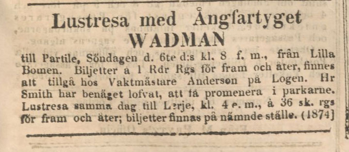 Hur kunde man roa sig en söndag i Göteborg 1841? Ett alternativ var att åka på lustresa med något av de ångfartyg som hade börjat att trafikera inte bara skärgården utan även Säveån upp till Partille. för 1 Rdr Rgs kunde man få en biljett hos vaktmästare Anderson på Logen för en resa med Ångfartyget Wadman. Smith som ägde Partille hade gett löfte om att besökarna skulle få promenera i parken.