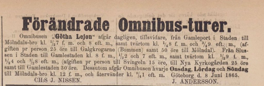 ”Från och med i går har en större omnibus börjat underhålla kommunikationen mellan staden och Mölndal samt staden och Gamlestaden. Omnibusen, som benämnes ”Göta Lejon”, är elegant och komfortabel (bl.a. försedd med särskild rök-kupé, rymmande 5 à 6 personer) samt tyckes vara af en särdeles inventiös konstruktion. Det är hrr Ch. Nissen och J. Andersson, som satt sig i spetsen för denna allmänheten säkerligen mycket välkomna anordning.” (Ur: Göteborgs-Posten 8 juni 1865)