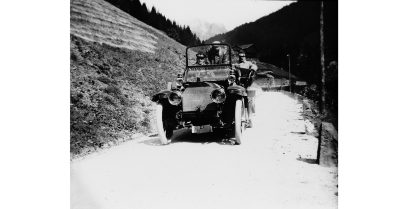 Skioptikonbild med motiv av Sigurd Curmans sällskap i bil på landsväg i Tyskland eller Sydtyrolen, Italien. Bilden har förvarats i kartong märkt: Höstresan 1904. Pordoi 8. Bozen 6. N:17.