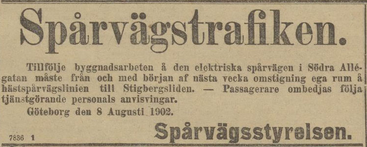 – Genom annons i dagens tidning tillkännagifver spårvägsstyrelsen, att från och med början af nästa vecka omstigning, d.v.s. ombyte af vagnar, kommer att ega rum å spårvägslinien till Stigbergsliden. Arbetena å den nya elektriska spårvägen påbörjas nämligen då i Södra Allégatan, i hvilken gata vagnombytena till en början försiggå. Då emellertid vid arbetenas framåtskridande den sträcka, som passagerarne få tillryggalägga till fots, efter hand kommer att betydligt ökas, ämnar spårvägsstyrelsen anordna ett provisoriskt spår för hästspårvagn i Norra Allégatan hvarigenom omstigningen förlägges å Järntorget och passagerarne endast få ett kort stycke att gå. Vid ombyte medföljer spårvagnens konduktör, så att särskilda öfvergångsbiljetter behöfva ej utdelas.” (Ur: Göteborgs Aftonblad 9 augusti 1902)