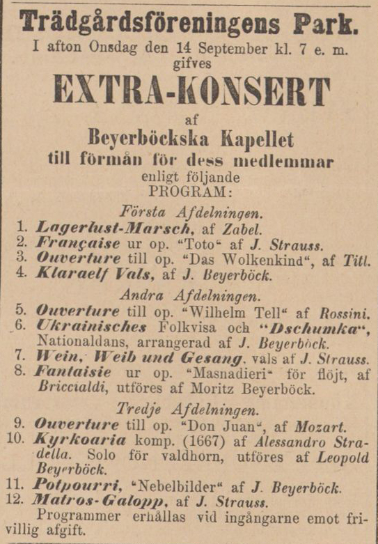 ”I Trädgårdsföreningens park gifves i afton en extrakonsert af och till förmån för Beyerbockska kapellets medlemmar. Det i dagens n:r införda programmet är efter vanligheten godt, som man finner, och upptager äfven ett par här förut ej gifna nummer. Då väderlekens allt mer och mer höstlika anstrykning utan tifvel snart nog lägger hinder i vägen för alla förlustelser i fria luften, gissa vi att allmänheten skall begagna detta tillfälle att bringa det utmärkta kapellet en välförtjent hyllning.” (Ur: Göteborgs-Posten 14 september 1870)