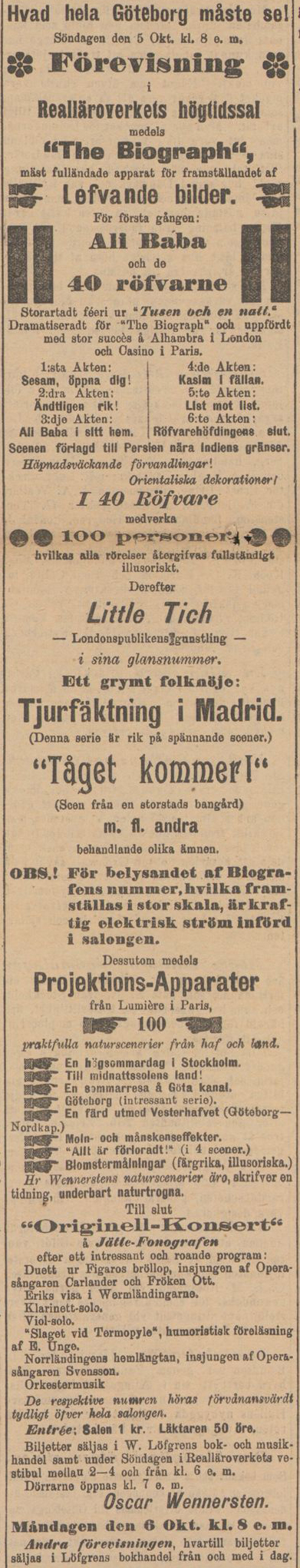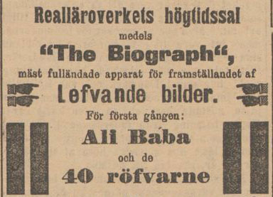 ”Ali Baba och de 40 röfvarne, hvartill motiv hämtas ur sagan med samma namn i ’Tusen och en natt’, kommer hr Oscar Wennersten att i morgon afton och de närmast följande dagarne förevisa i Reallärovärkets högtidssal medels ’The Biograph’, den mäst fulländade apparat för framställandet af s.k. lefvande bilder. Programmet i öfrigt upptager dessutom många sevärda scener, såsom den engelske humoristen Little Tich i sina mäst dråpliga nummer, tjurfäktning i Spanien samt en mängd konstnärligt återgifna naturscenerier från skilda land och haf, framställda medels projektionsapparater.