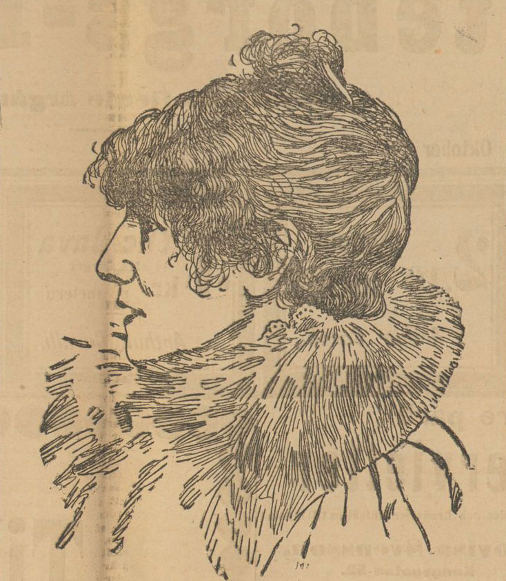 ”Sarah Bernhardt anländer, som bekant, hit i dag kl. 9,25 f.m. med nattsnälltåget från Kristiania. Säkerligen skola många begagna sig af tillfället att vid Bärgslagernas station hälsa den stora divan, som – vi djärfvas vara nog indiskreta – i går fyllde 58 år, välkommen på nytt till Göteborg, där hon icke varit sedan juni 1883. Vi meddela ett porträtt af Sarah i privatlifvet äfvensom en bild från hennes uppträdande i Stockholm som Hamlet, i hvilken intressanta uppgift vi tyvärr icke få se henne.