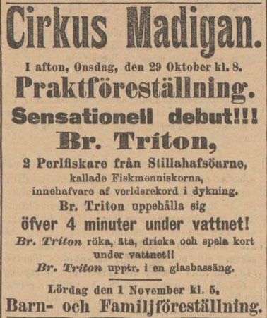 ”Cirkus Madigan har sedan i går fått ett sensationellt dragningsnummer, ett av vattenkonstnärerna, bröderna Triton, som utföra det mäst häpnadsväckande saker under vattenytan.