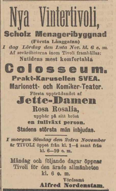 ”Göteborgs Vinter-Tivoli som nu har inflyttat i f.d. Scholz’ menageribyggnad var under gårdagen till trängsel besökt och syntes besökarne, mest småttingar, med förtjusning taga del af de många förlustelser som det finnas att välja på. Största frekvensen rönte nog den präktiga karusellen, kasperteatern och ’Coloseum’, å hvilket sistnämnda ställe man fick se den stora jordbäfningen i Schemacha 17 febr. i år, tjurfäktning i Spanien, gorilla- och lejonjakter, mordet å amerikanske presidenten Mc Kinley m.m. Stort tillopp var äfven vid skjutbanan samt jättedamens förevisande. Som man ser är det ett litet Eldorado för de små som nog ej komma att underlåta besöka tivolit.” (Ur: Göteborgs Aftonblad 3 november 1902)