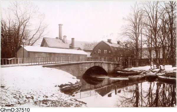 Mölndalsån vid Gullbergsbron. I bakgrunden Thormählen & Hoppes fabriker samt (med fyra gavelfönster) hus tillhörande stadens 12 rote, nr 19, år 1902.