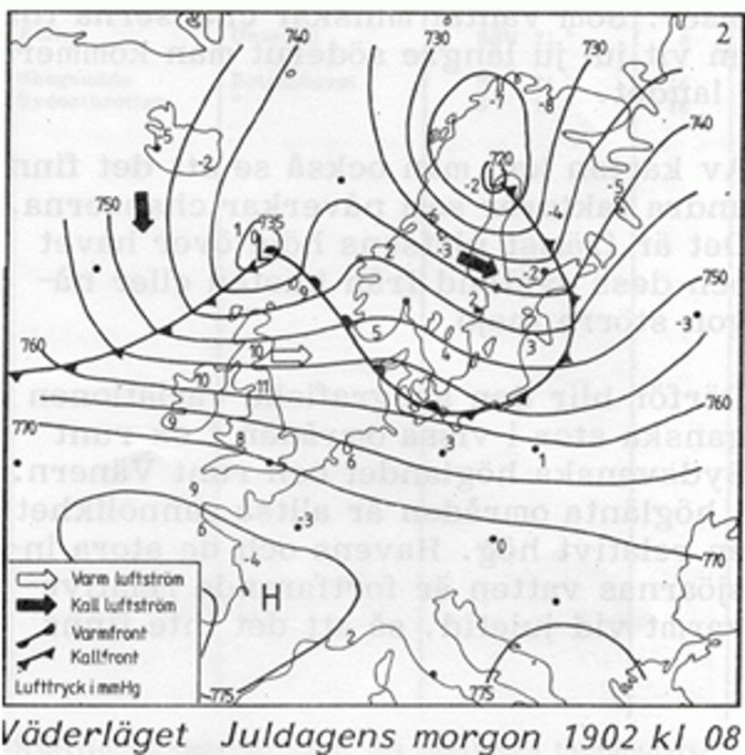”Juldagens förmiddag rådde solsken och vackert väder, som dock på middagen efterträddes af regn och rusk, samtidigt som blåsten började tilltaga allt mera. Framåt kvällen stormade det kraftigt från sydvest, men vinden drog sig framåt natten öfver till nordvest och växte så småningom till en af de svåraste orkaner, som gått öfver vårt land.