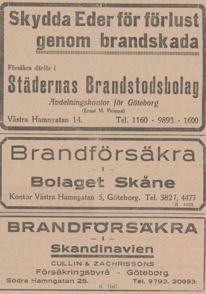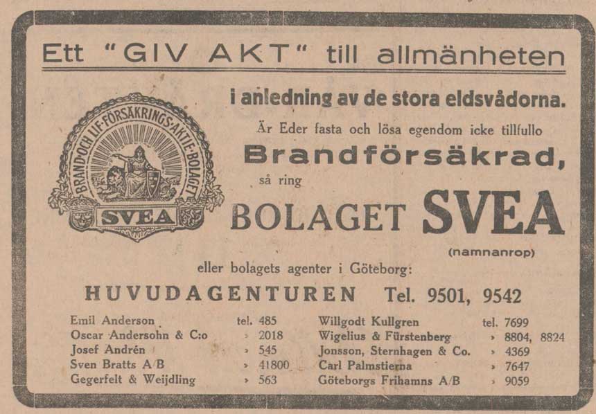 En mängd brandförsäkringsbolag passade på att annonsera på samma sida i Göteborgs Dagblad som artikeln om branden i stationsbyggnaden.