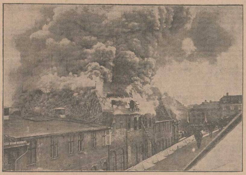 Under tiden tätnade folkmassorna på torget. Man förvånade sig över, att det skulle vara så svårt att göra slut på elden. Men snart gick det upp för var och en, att det icke var en vanlig liten eldsvådeunge. Rökmolnen tätnade och skymde solen, lågorna slogo upp genom taket, och hela torget insveptes i en kvävande rök. Då och då hördes signalerna, när nya brandbilar skyndade till undsättning, men det var endast med möda, som den talrikt församlade polisstyrkan under intendent Björkmans befäl kunde bereda väg genom mängden.