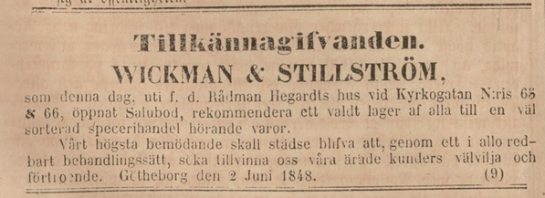 Det första meddelandet om firman förekom i Göteborgs Handels- och Sjöfarts-Tidning den 4 april, då under Tillkännagivanden lästes: ’Att vi denna dag ingått bolag till bedrivande av handelsrörelse, under firma Wickman & Stillström, få vi, författningarna likmätigt, härmed tillkännagiva. Göteheborg den 1:ste april 1848. A.N. Wickman, Ed. Stillström.’ Kort tid därefter fick man genom annonser veta en del av det den nya firman förde i handeln och vad som på den tiden smekte göteborgarnas gommar. Där förekom ’smör från Dahlsland’ till salu i kommission, ’Distillerade Bränviner från Stockholm av Carl Falkmans berömda tillverkning’, holländsk Stolckscher-ost, Stockholms Bäjerskt öl ’av den omtyckta sorten nu åter inkommet och om några dagar, sedan det behörigen hunnit klarna efter resan, att tillgå’ etc., ’ Äkta ostindisk Soja av sällsynt fin kvalité, på buteljer direkt inkommen från Canton’, sardiner i olja ’uti hermetiskt tillslutna askar’ o.s.v.