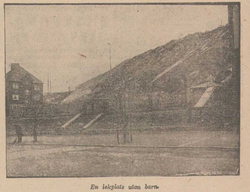 Vid Högegatan, strax nedom Redbergsparken, har man anlagt en lekplan inklämd mellan tvenne husväggar och en brant bergvägg. En väldig stenterrass har uppfört, stora stenblock ha rest som stöd åt staketet. En säkerligen ytterst dyrbar anläggning på en stor och dyrbar tomt. Allt är så ypperligt. Det finns egentligen endast ett enda litet fel. Att endast undantagsvis en barnunge förirrar sig dit. Helt naturligt förresten, då parken, som är en mycket trevlig lekplats, ligger alldeles ovanför, öppen för sol och friska vindar. Men kring Bagaregården låg ett ypperligt område för både stora och små barn. Och de ville så gärna dit. Till den friska grönskan i de gamla trädens ljuvliga skugga. Men där var det stängt. Lustgården vaktades av keruben – poliskonstapeln. För att sen skövlas och bebyggas. Man häpnar inför sådan visdom. Är det ett litet uttryck för den s.k. sparsamhet, som nu härjar och förhärjar vårt land och vår stad. En dyrbar sparsamhet, som spolierar oersättliga värden. Det enda som verkligen sparas med och det effektivt nog tycks vara den dyrgrip, som kallas vanligt sunt förnuft.