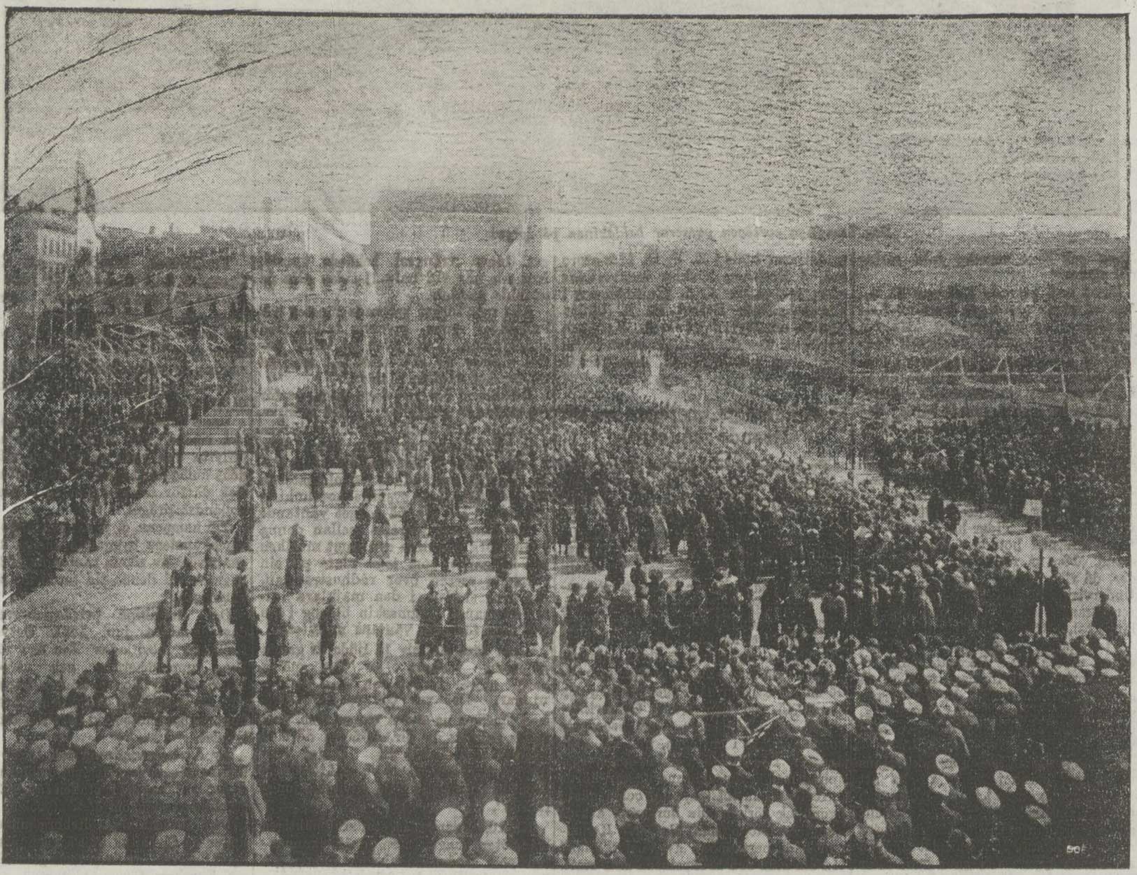 Vägen upp till Minneshallen kantades av scouter och kustartillerister. Rakt framför Minneshallen hade rests en tribun, vid vilken studenter med blågula marskalksband voro stationerade. Nedanför minareterna och tribunen voro också härolder placerade.