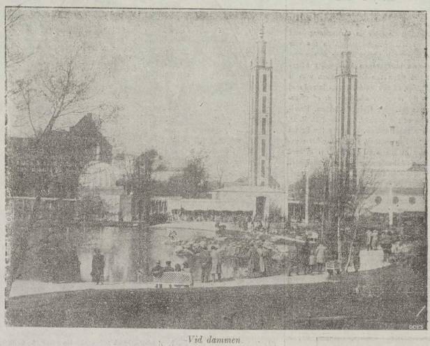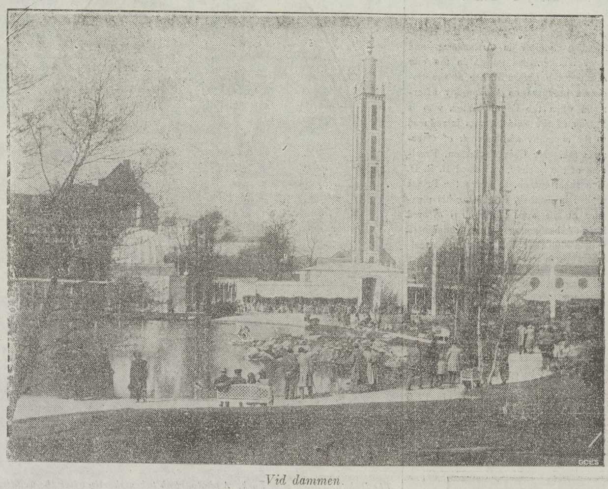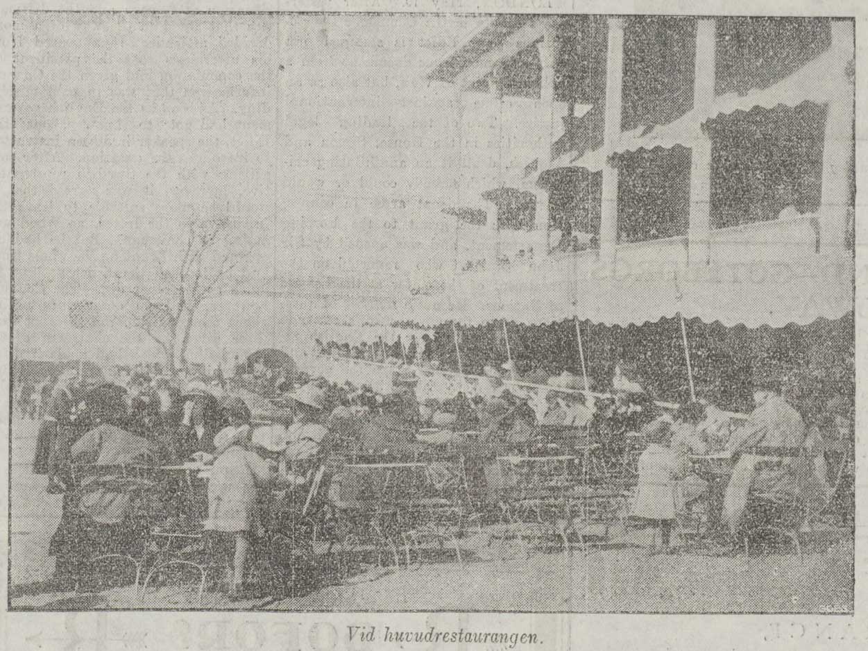 Men i går, på Kristi Himmelsfärdsdag, började göteborgaren den långsamma, ingående rundtur, som han hoppades ha fullbordat före den 1 oktober i höst. Det var verkligen mycket folk på utställningen i går, hela dagen och långt fram på kvällen, sedan de tusen ljusen och strålkastarna blivit tända. Säkerligen misstar man sig inte, om man påstår att en mycket stor del av Göteborg har ömma fötter i dag. Det ’tar’ nämligen på ett högst överraskande sätt att i bekväm lunk vandra omkring i utställningssalar, och de nygrusade gårdarna äro ännu så länge mycket tröttande. Den som lyder vårt råd att ta det så vackert under de första besöken, kommer absolut inte att ångra sig.