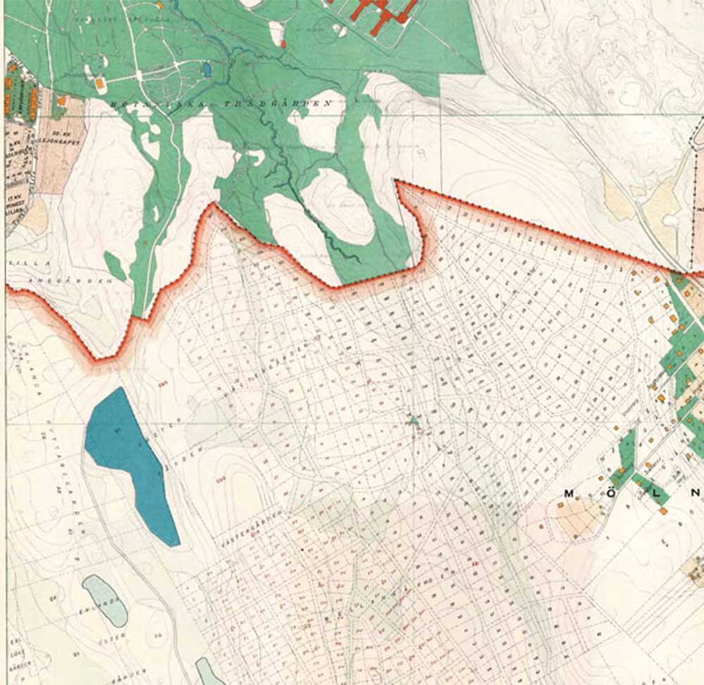 Efter ett bifallsyrkande av hr Elfving meddelade ordf., att han för sin del tänkt sig området upplåtet för villabyggnader av någorlunda omfattande dimensioner på tomter mellan 25 à 300,000 kvf. Därigenom skulle en viss säkerhet i ekonomiskt hänseende vinnas. Hr Björklund talade även för bifall och påpekade den betydelse för frågans lösning en kommande gränsreglering mellan Göteborg och Mölndal medför. Stadsfullmäktige biföllo därefter enhälligt byggnadsnämndens förslag liksom dess hemställan till k.bfhde om byggnadsförbud på området i fråga. Vidare beslöts uppdraga åt beredningsutskottet att föreslå en 5-mannakommitté för den blivande gränsregleringen mellan de båda städerna.” (Ur: Göteborgs Handels- och Sjöfartstidning 25 maj 1923)