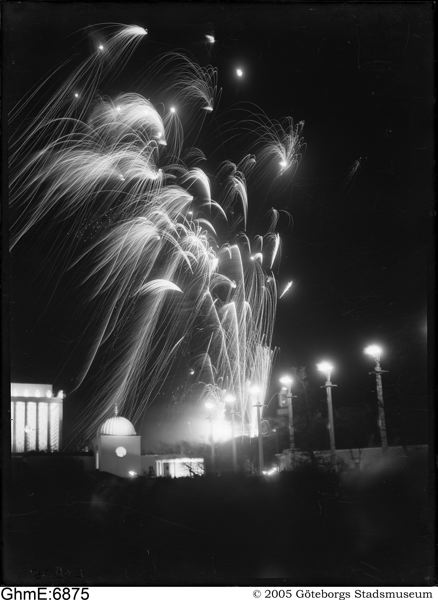 ”På utställningen avslutades den svenska flaggans dag i går med ett fyrverkeri. Vädrets makter voro gynnsamt stämda, och efter allt regnandet fingo vi en vacker afton. Trots den ljusa sommarnatten, gjorde sig fyrverkeriet utmärkt för de tusenden, som samlats på stora gården och kring näckrosdammen. Man måste bara undra, varför de bästa utsiktspunkterna ej i högre grad utnyttjades av publiken. Både från baksidan av minneshallen, och från gården utanför fiskrestauranten hade man nämligen en utmärkt överblick över fyrverkeriet, men dit hade endast ett fåtal personer begivit sig. Fyrverkeriet var dessutom synligt över större delen av staden och långt in över Hisingen. Både i Kungälv och Kungsbacka kunde man se raketerna och bomberna under invigningsfyrverkeriet, och detta har säkert varit fallet även denna gång.
