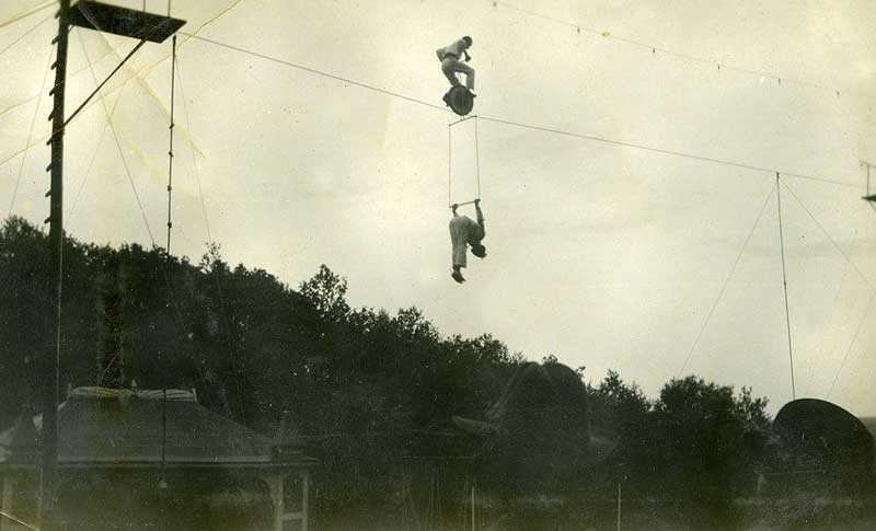 ”Det har nu gått så långt, att direktör Jenzén måste klaga över för mycket folk på nöjesfältet. Det är de engelska lindansarna, som jämte de övriga attraktionerna samla så mycket folk, att en rent livsfarlig trängsel uppstår runt tivolidammen och helt upp i backarna bakom Lisebergs värdshus. En situation sådan som i söndags kväll, vågar man inte ånyo utsätta sig för. Man har därför fått gripa till den åtgärden att avspärra tillträdet till nöjesfältet en halvtimma innan lindansarna skola uppträda. Tills vidare komma dessa dock att uppträda varje kväll. Däremot är det möjligt att man tvingas avstå från de mera halsbrytande akrobatnummer, som senare skulle ha kommit. Det hade annars varit meningen att släppa upp en ballong captif ett hundratal meter och låta en trupp akrobater utföra sina konststycken där uppe. I den trängsel, som då skulle uppstå, bleve det nog farligare för folk på marken än för akrobaterna där uppe.” (Ur: Göteborgs Handels- och Sjöfartstidning 20 juni 1923)