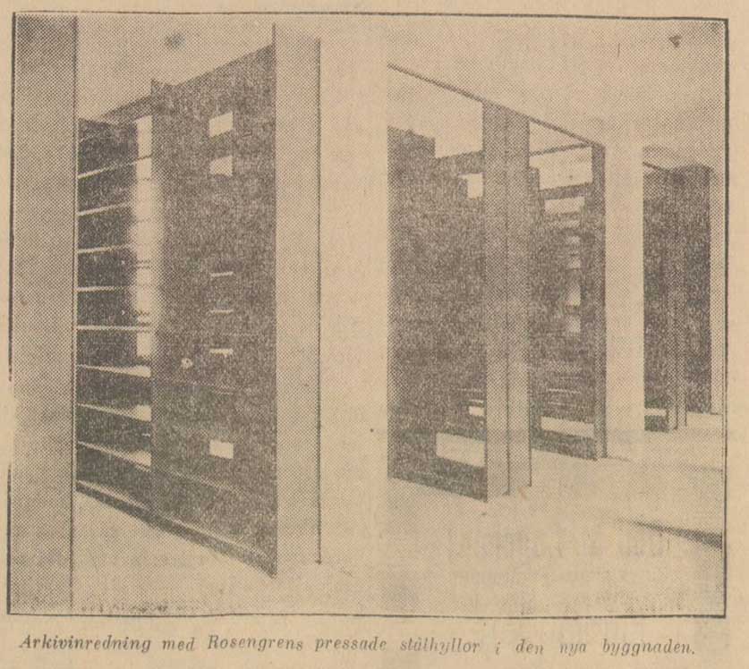 Ett särskilt omnämnande förtjänar Rosengrens kassaskåpsfabriks hyllinredningar. Deras, som återfinnas till ett antal av fem i olika valv i bottenvåningen, samt i bottenvåningens och andra och tredje våningarnas arkivrum, (2 i varje våning), äro utförda av stål, lätta och eleganta, särskilt i jämförelse med trähyllor, vilka ej erbjuda samma stabilitet och varaktighet. Dessutom äro de lätt flyttbara, lämpa sig för alla format och förändringar, varjämte de äro lätta att hålla rena och således mycket hygieniska. Lokaltelefonerna äro från Siemens-Schuckert, Stockholm.