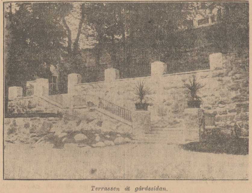 Även gården förtjänar ett par ord. Den är synnerligen stor och rymlig och överflödar av blommor och grönt. Särskilt lyckade äro de många terrasserna med deras mängder av buskar och andra växter.