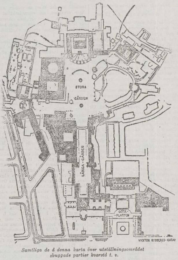 Hela den del av utställningen, som ligger väster om Södra vägen, kommer alltså t.v. att till det yttre kvarstå i sitt nuvarande skick, medan de bakomliggande partierna rivas. När dessa äro borta blir det en jämförelsevis lätt sak att få bort de återstående delarna. Så fort det är möjligt, ämnar man öppna en trafikled från Lorensbergsområdet över Stora gården till Korsvägen.