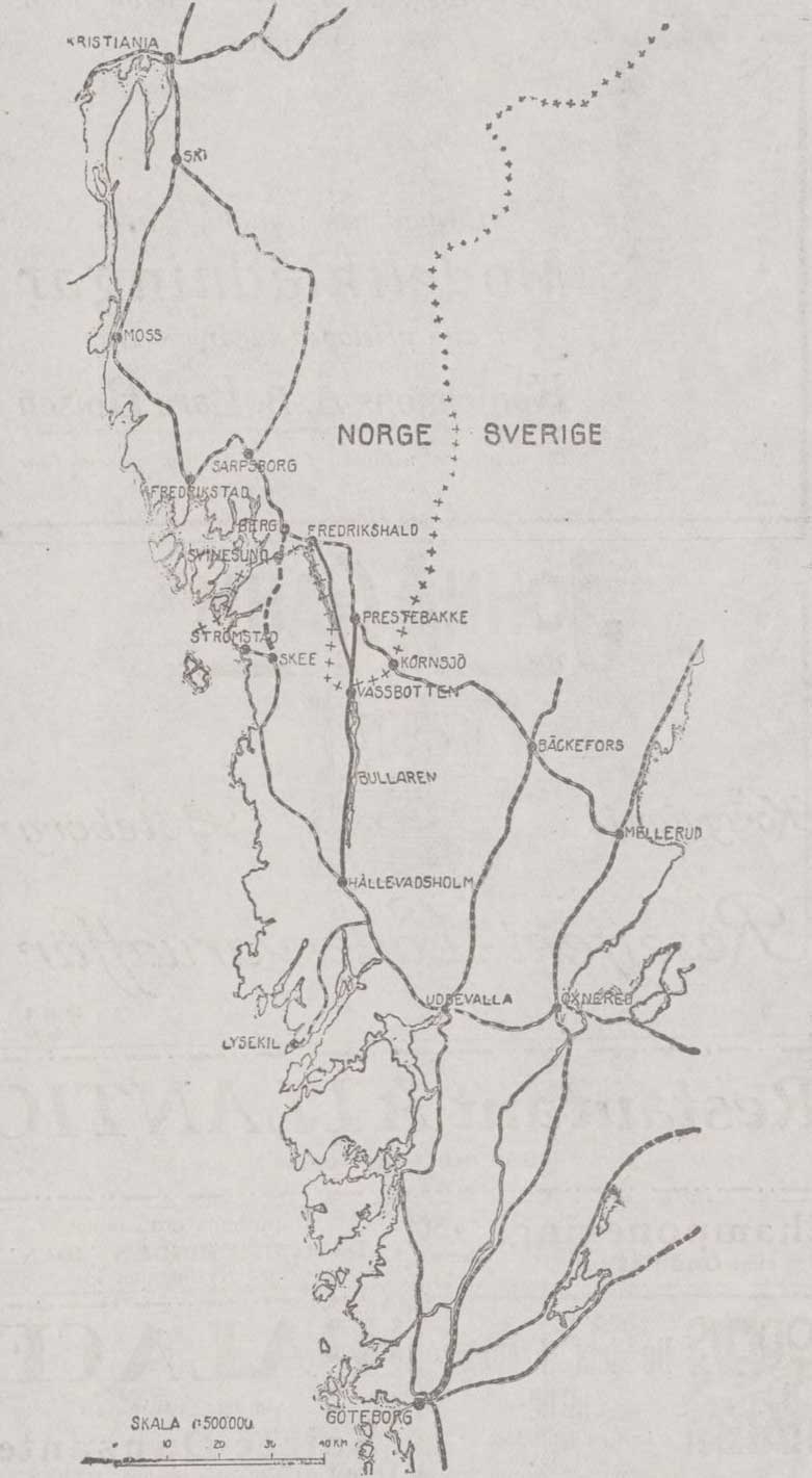 Vi meddela här ovan en kartskiss över de förslag, som komma ifråga. Den streckade linjen är Skee–Svinesund–Berg, som uppgivits ha störst sympatier på svenskt håll. Den svarta linjen är Hellevadsholm–Vassbotten, för vars fortsättning in i Norge finnas två alternativ, ett med anslutning till nuvarande norska järnvägsnät vid Prestebakke station och ett, där linjen framdrages till Fredrikshall.” (Ur: Göteborgs Handels- och Sjöfartstidning 3 november 1923)