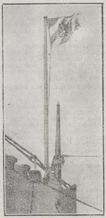 Vi gjorde på sin tid och i samband med förslagets framställande en rundfråga hos rederierna, och svaren utföllo så, att man inom kort kunde vänta att flaggan komme i allmänt bruk. Ett flertal rederier har redan beställt den nya göteborgsgösen, och det första fartyg, som hissat en dylik är Transatlantics ångare ’Tasmanic’, varifrån ovanstående fotografi är taget.